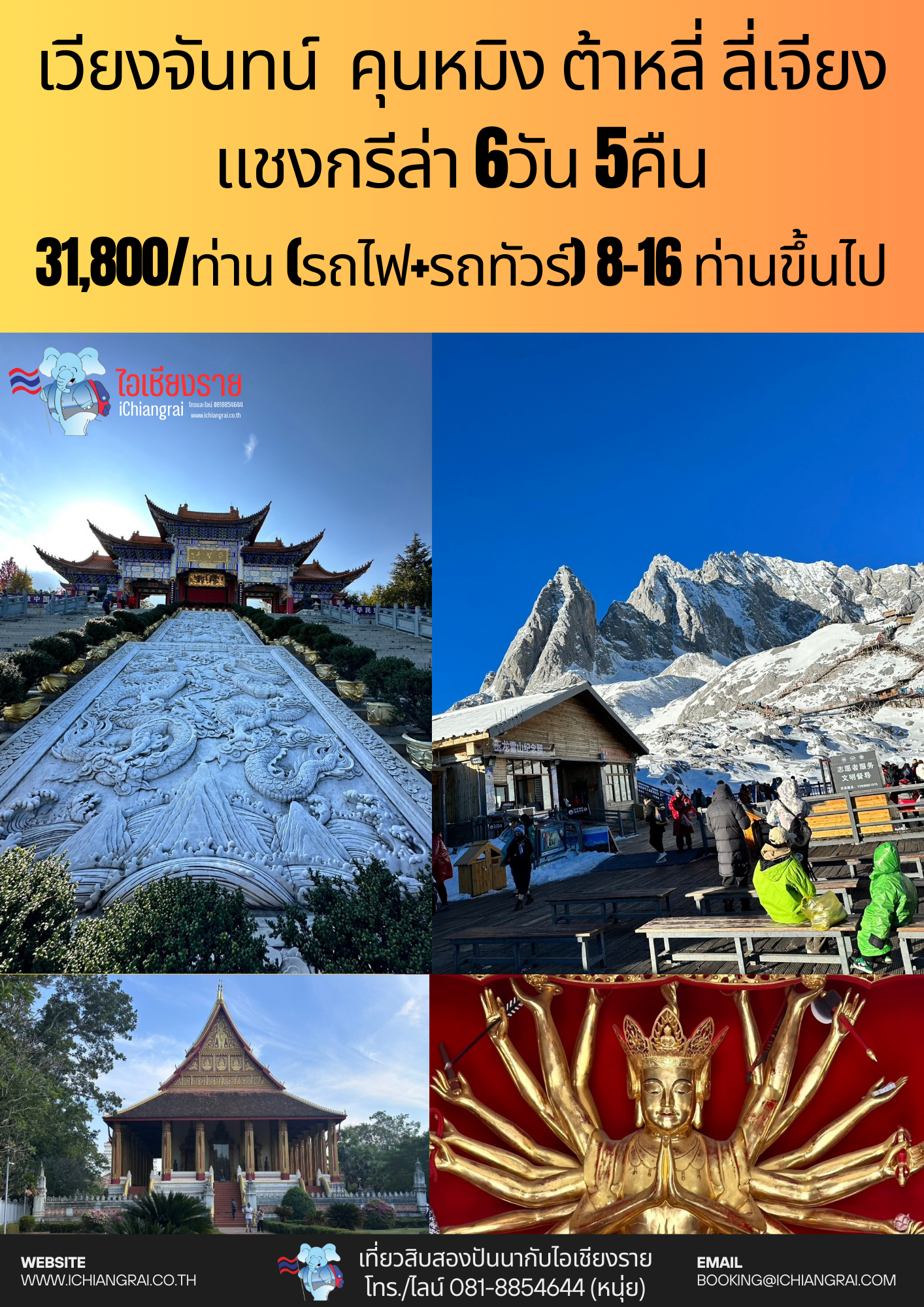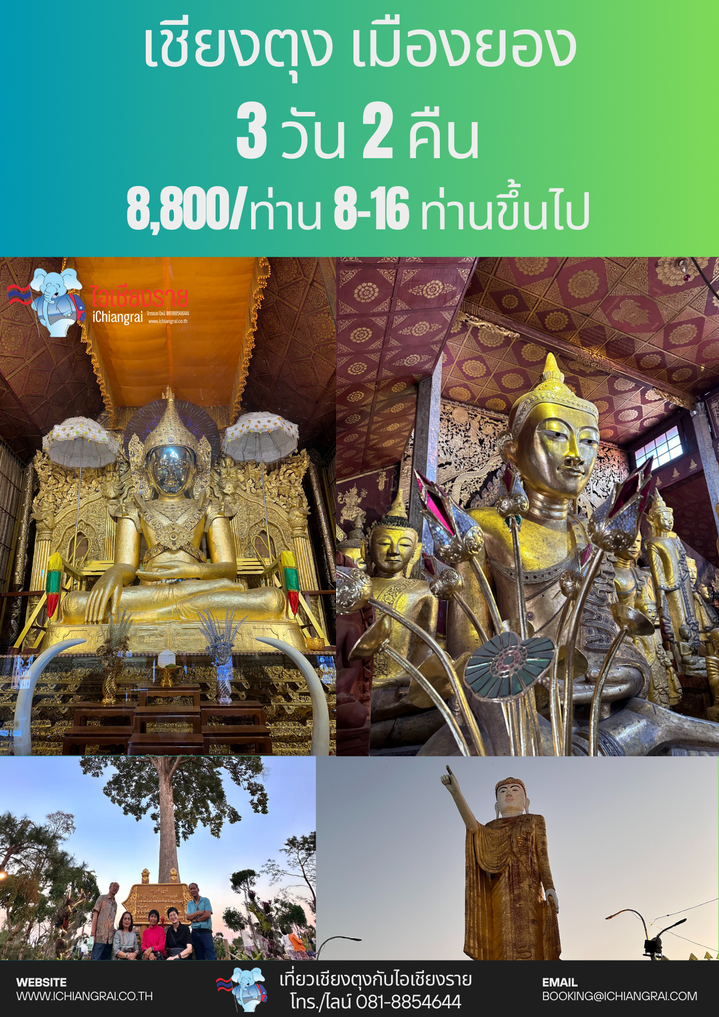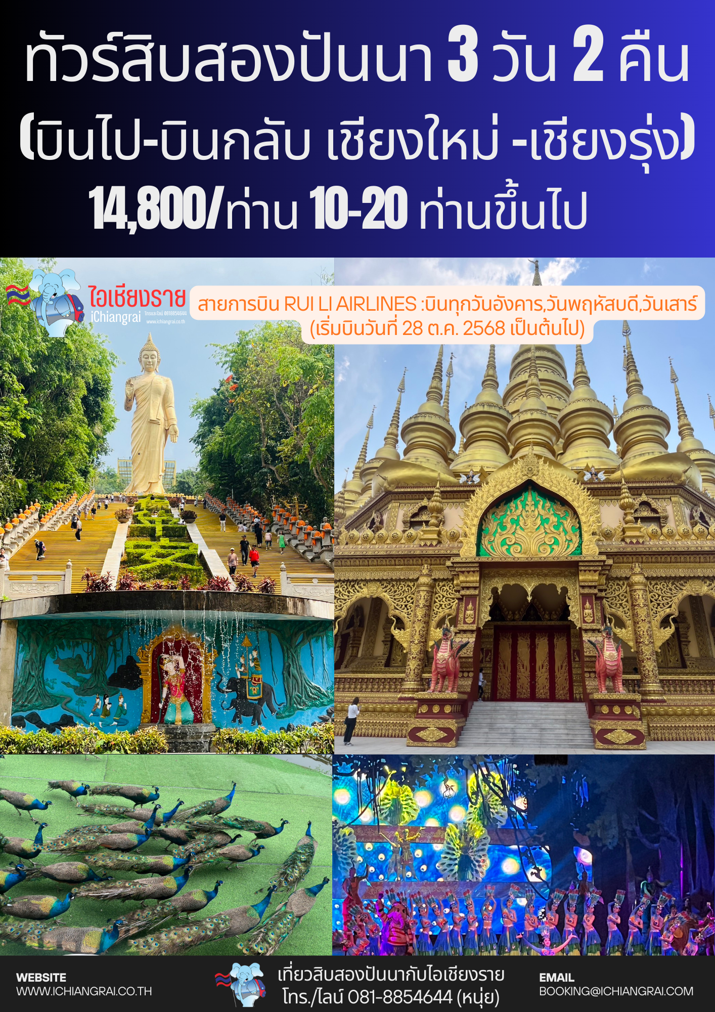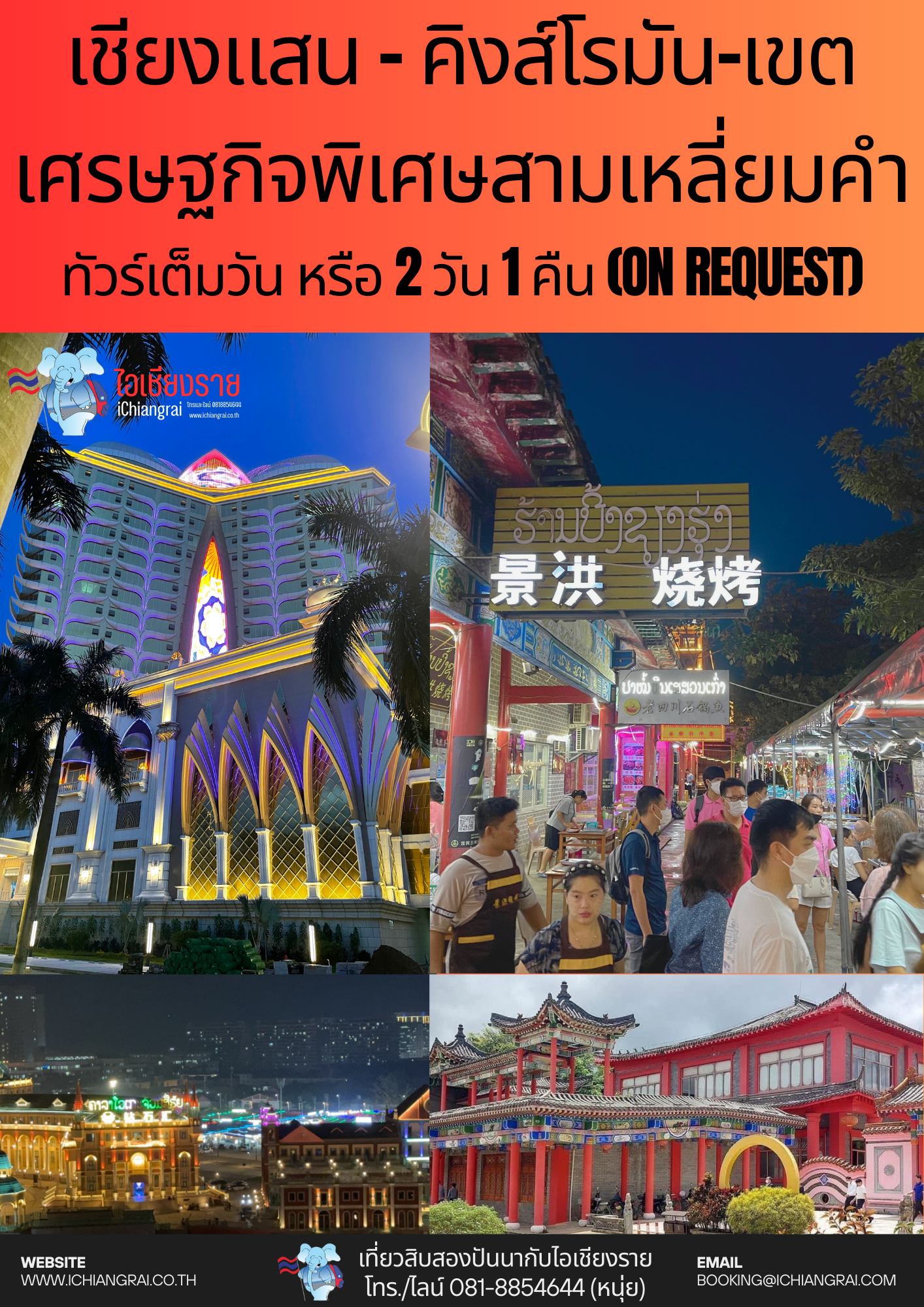 เชียงราย เชียงราย มนต์เสน่ห์แห่งอารยธรรมล้านนา กิจกรรมส่งเสริมการท่องเที่ยวในแหล่งอารยธรรมล้านนา เพื่อพัฒนาอัตลักษณ์ของการท่องเที่ยวเชิงวัฒนธรรม เพื่อเป็นการส่งเสริมการท่องเที่ยวให้นักท่องเที่ยวในรูปแบบการท่องเที่ยวเชิงวัฒนธรรม เพื่อเป็นการประชาสัมพันธ์แหล่งท่องเที่ยวเชิงวัฒนธรรม เพื่อเป็นการฟื้นฟูและพัฒนาแหล่งท่องเที่ยวที่มีชื่อเสียง (1) ทัวร์เชียงรายมนต์เสน่ห์ล้านนา (2) แม่สาย ท่าขี้เหล็ก ไหว้พระ ช็อปปิ้ง ครึ่งวันครบสูตร