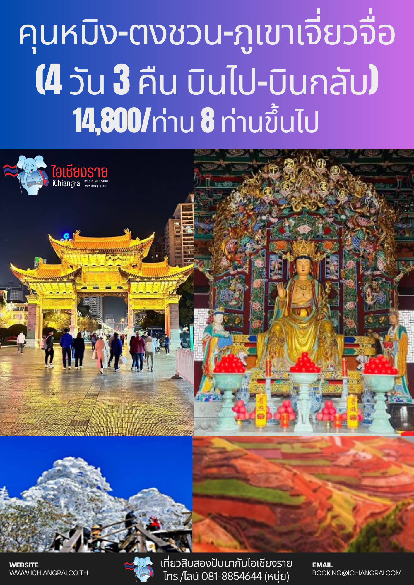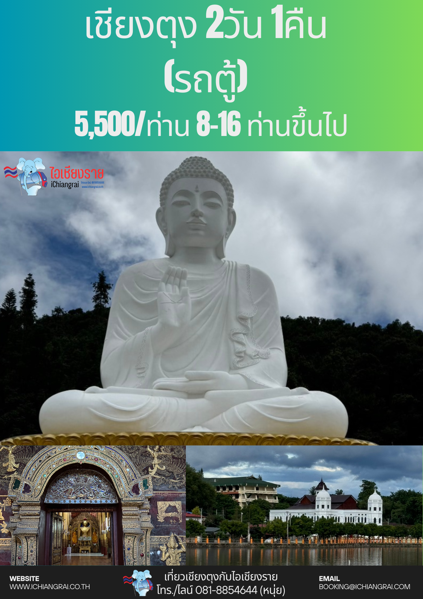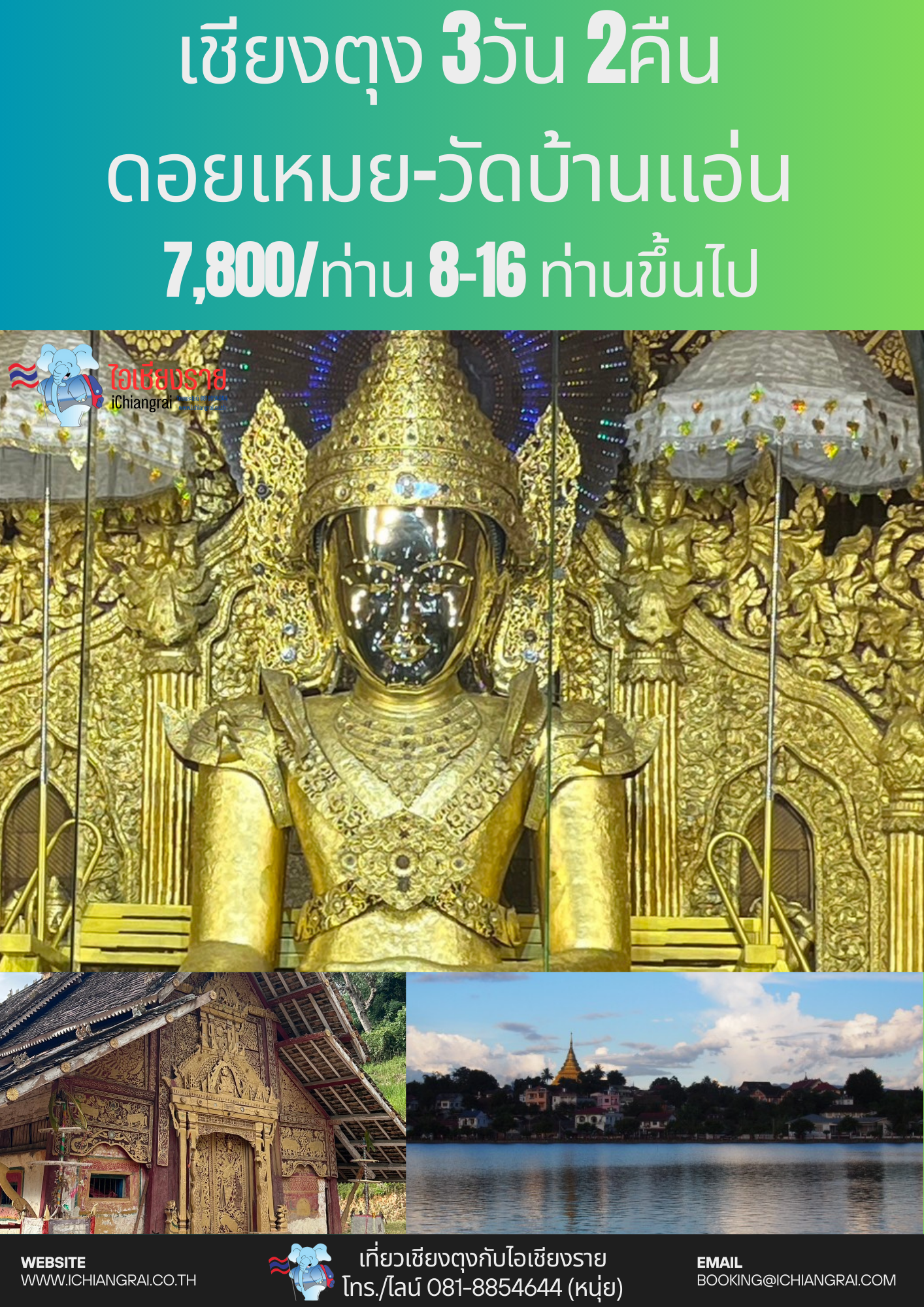เชียงราย เชียงราย มนต์เสน่ห์แห่งอารยธรรมล้านนา กิจกรรมส่งเสริมการท่องเที่ยวในแหล่งอารยธรรมล้านนา เพื่อพัฒนาอัตลักษณ์ของการท่องเที่ยวเชิงวัฒนธรรม เพื่อเป็นการส่งเสริมการท่องเที่ยวให้นักท่องเที่ยวในรูปแบบการท่องเที่ยวเชิงวัฒนธรรม เพื่อเป็นการประชาสัมพันธ์แหล่งท่องเที่ยวเชิงวัฒนธรรม เพื่อเป็นการฟื้นฟูและพัฒนาแหล่งท่องเที่ยวที่มีชื่อเสียง (1) ทัวร์เชียงรายมนต์เสน่ห์ล้านนา (2) แม่สาย ท่าขี้เหล็ก ไหว้พระ ช็อปปิ้ง ครึ่งวันครบสูตร